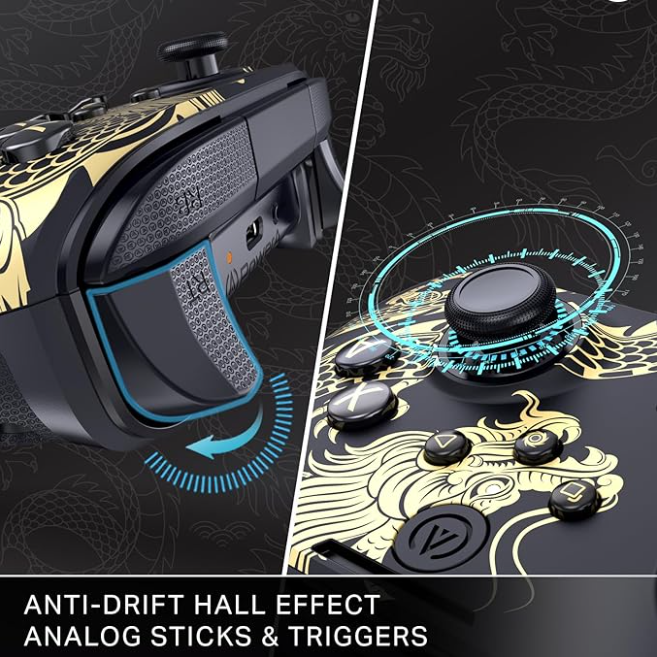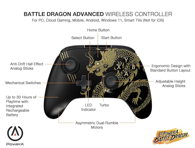 Dominate your opponent with the PowerA Battle Dragon Wireless controller for PC and Cloud gaming. You can choose between low-latency wireless connectivity on PC with a 2.4GHz USB adaptor, wired with the included USB-C cable or enjoy the flexibility of Bluetooth to game on Android, Tablet or Smart TVs. The Battle Dragon Wireless controller is equipped with magnetic Hall effect triggers for a smoother pull and reliable precision than contact-based triggers. Gain an edge with high-performance features like 3-way trigger locks, 4 mappable Advanced Gaming Buttons, and a programmable Turbo Button. This feature packed controller also includes a rechargeable battery and app support to fine-tune your controller settings.